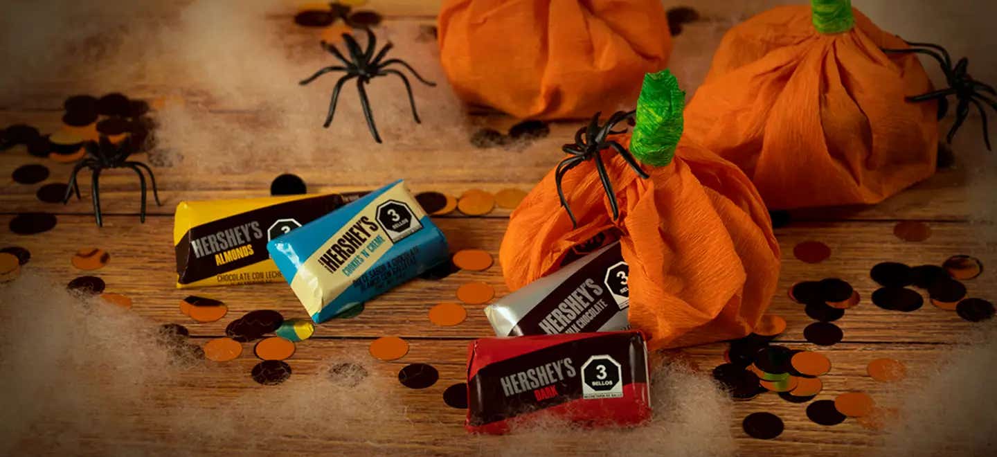 INSPÍRATE CON IDEAS PARA UNA NOCHE DE DIVERSIÓN Crea Murciélagos con tus barras HERSHEY'S Divertidos Juegos para Halloween Escobitas de bruja REESE’S Calabazas de papel rellenas de HERSHEY’S Miniatura Descubre estas ideas